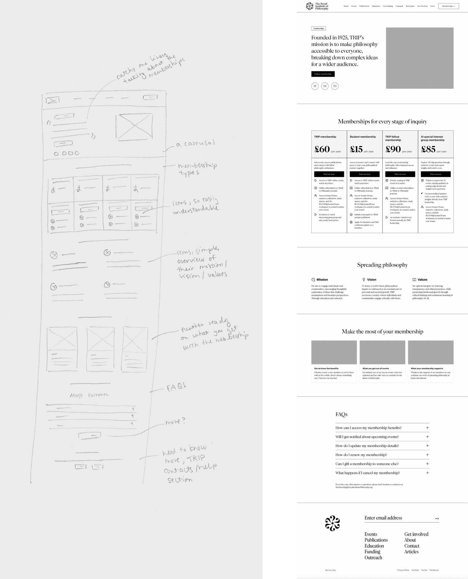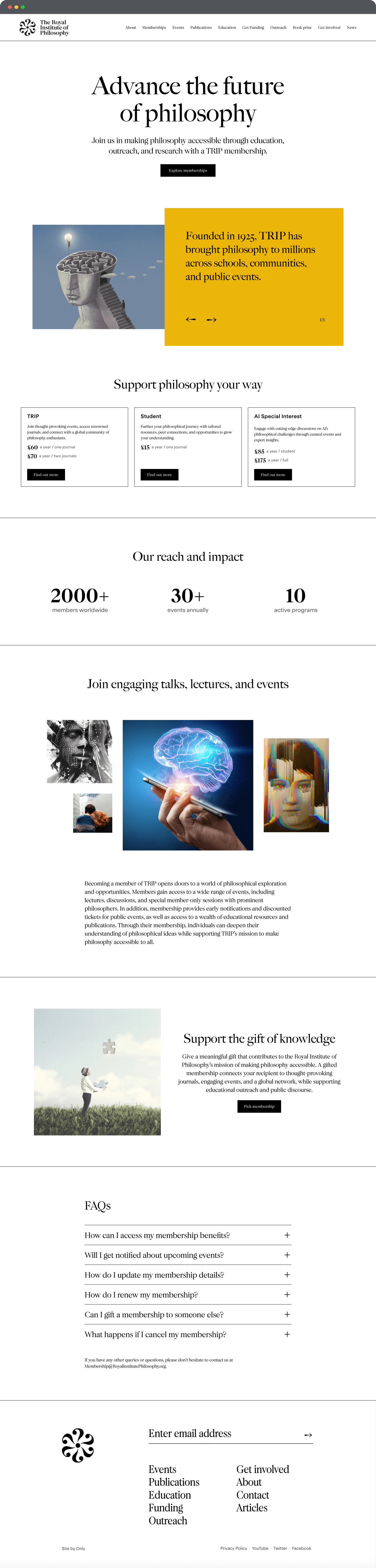 The Royal Institute of Philosophy (TRIP), a UK-based organisation with over 100 years of history, sought to launch a new membership programme. The goal was to strengthen its community while generating sustainable revenue. A key focus was the design of the "All Membership Types" landing page, which serves as the entry point for potential members to explore and select the membership that best suits their needs.
