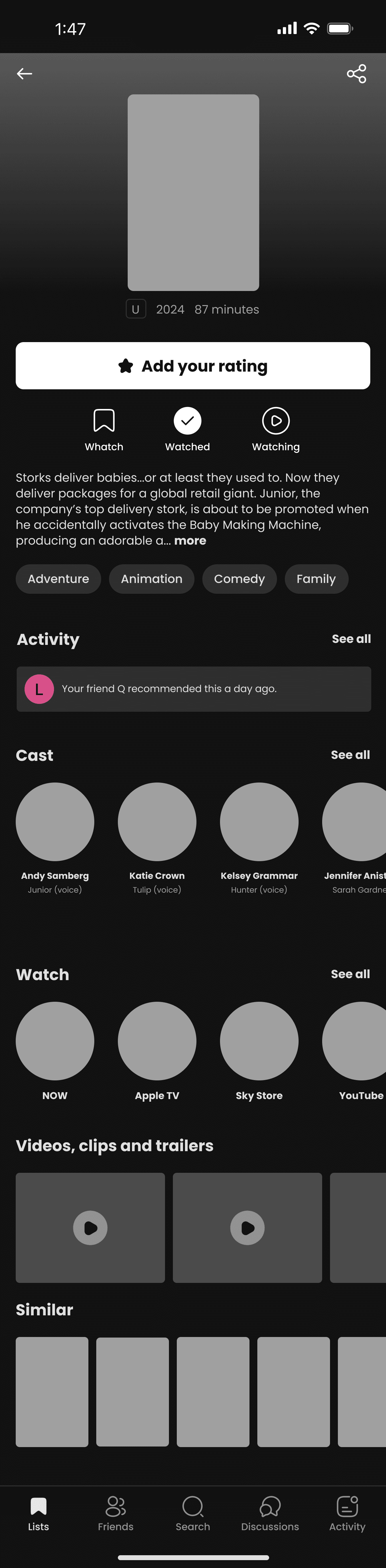 The final outcome of this project was an optimised, content-rich title screen experience for the Whatch app, designed to tackle the issues of engagement loss and limited content discovery. The new title screen encourages users to explore deeper, add titles to their watchlist, and share them with friends. The updated title screen is now used on both iOS and Android platforms, effectively transforming it into a hub for content discovery and improving business growth.
